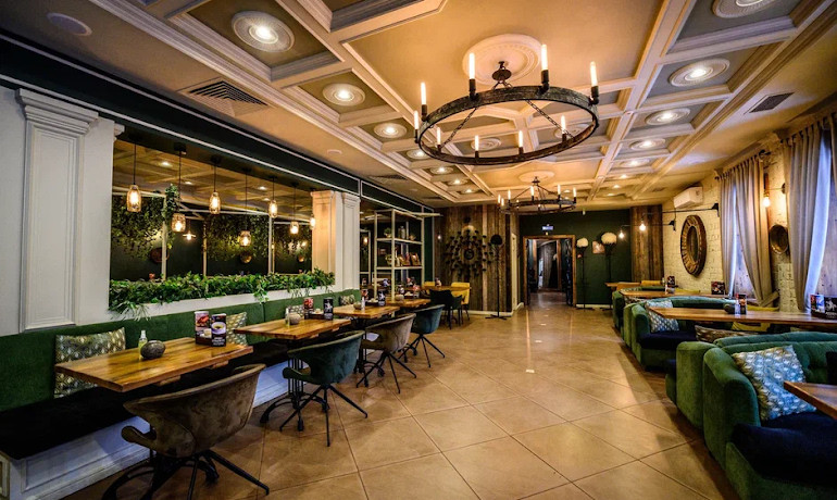 Интерьер ресторана выполнен в современном стиле с дизайнерскими элементами и не требует дополнительного оформления.